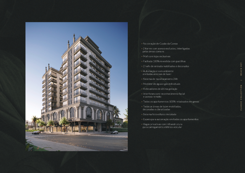 Edifício Beach Sky em Capão da Canoa Edifício Beach Sky - O 1° resort vertical do RS, localizado no coração de Capão da Canoa, com arquitetura imponente e sofisticada, acabamentos meticulosamente pensados para surpreender, natureza e ambientes de lazer que inspiram momentos únicos. - Beach Sky - Piscina semi olímpica, deck molhado, hidromassagem, playground, espaço pet friendly, lounge fire, lounge drink, lounge sunset, sky gourmet, banheiros, áreas para caminhada. - Beach Homes - Apartamentos de 2 e 3 dormitórios que vão de 77m° a 152m°.- 4th Floor - Campo de futebol society, salão de festas, academia, espaço Wellness by Instituto Burmann e Bastos, conveniência. - Parking - Beach Mall - 6 Lojas de alto padrão. Bem-vindo aos seus melhores momentos!
