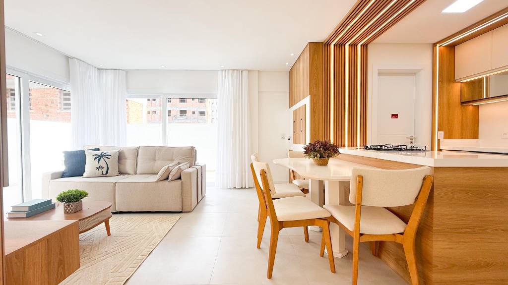 Mobiliado e Decorado ! Belíssimo apartamento de 2 dormitórios, suíte, banheiro social, cozinha estilo americana, área de serviço, living dois ambientes, acabamento classe AAA, apartamento com terraço, churrasqueira, todas as peças amplas e bem iluminadas, sol da manhã, box para carro. Edifício de alto padrão, hall de entrada, elevador, fachada revestida em plaquetas, salão de festas, piscina, uma quadra do mar